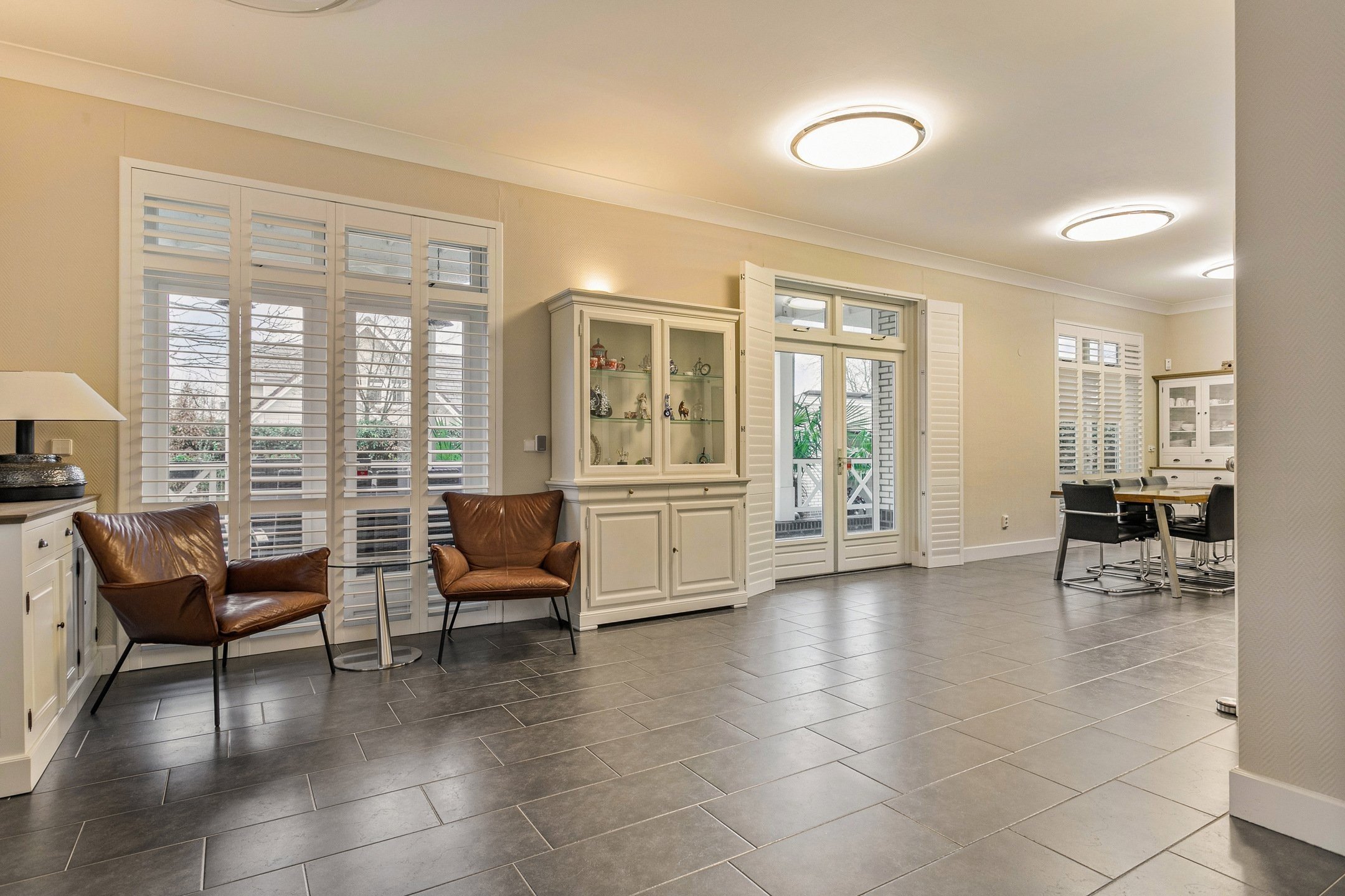 The spacious living room connects openly with the dining area and offers access to the backyard through French doors.