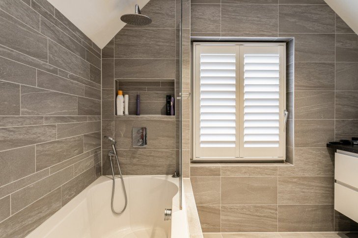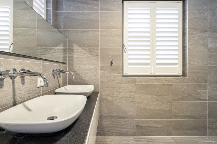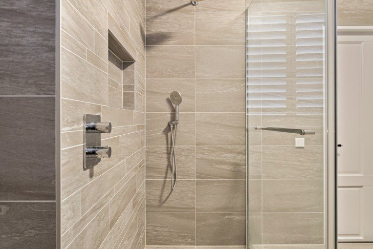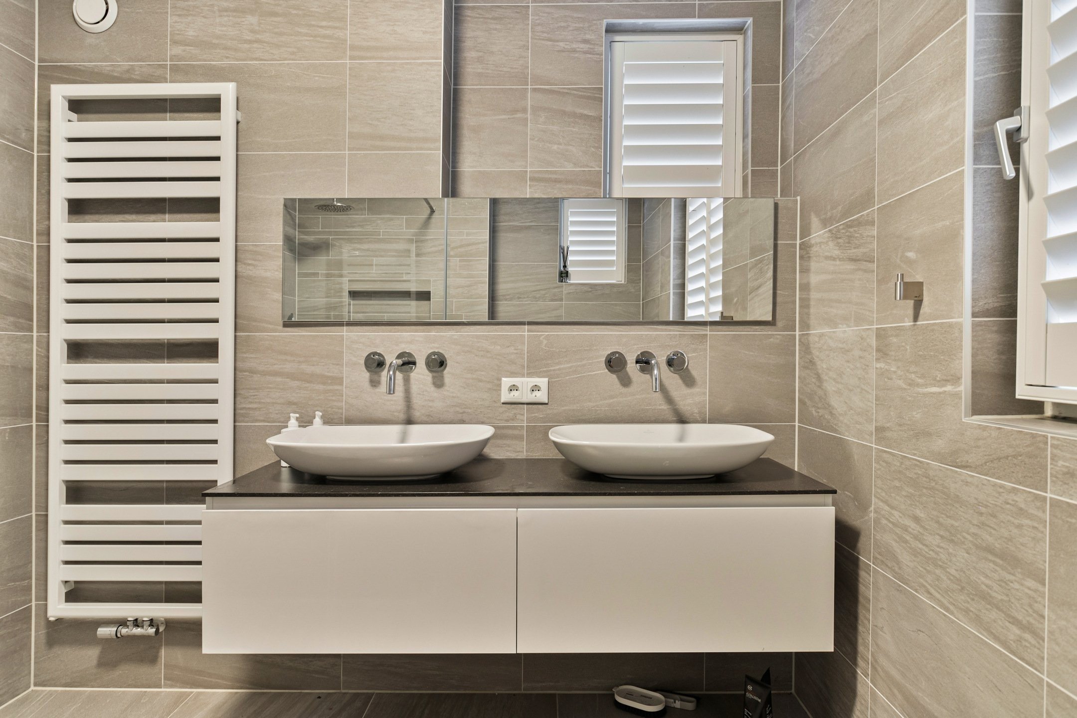 The bathroom is equipped with a double sink unit and a walk-in shower.