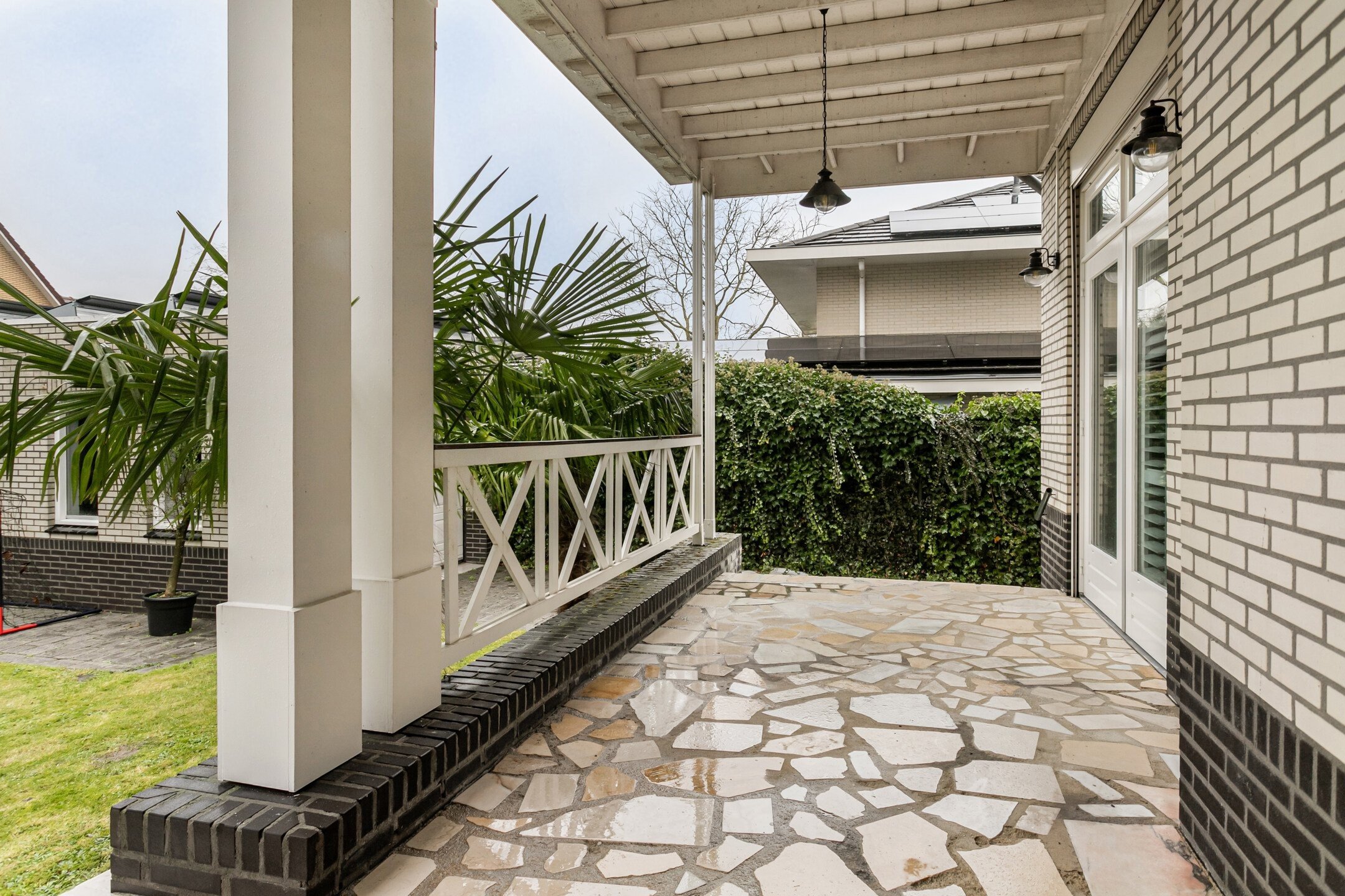 The property features a spacious southwest-facing backyard with a covered veranda, perfect for year-round outdoor enjoyment.