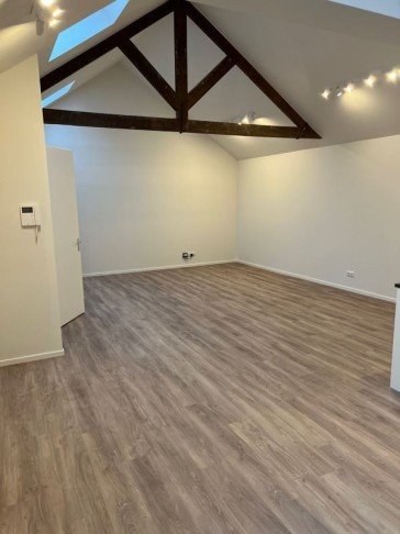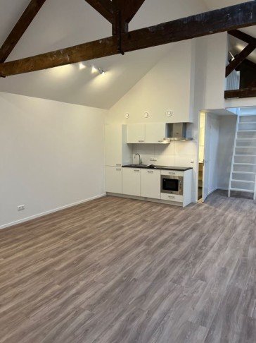 The studio has a living room with open kitchen, sleeping area in the attic and bathroom with toilet.