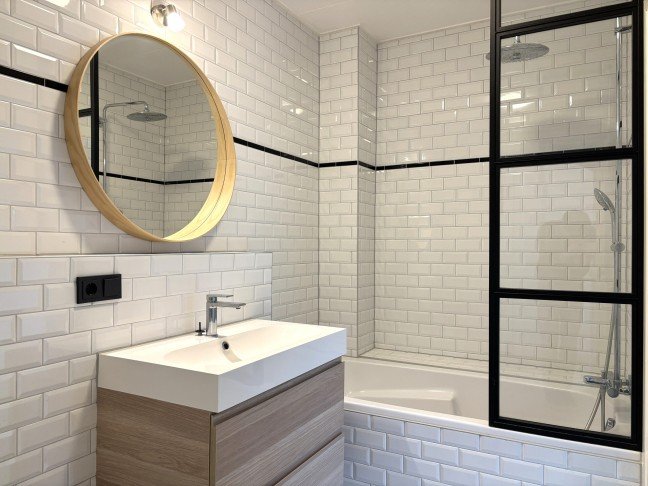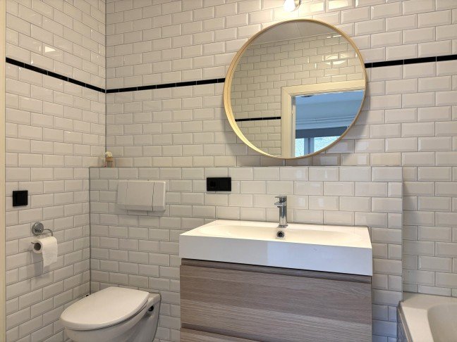 The bathroom has a modern finish with white wall tiles, black accents and a stylish round mirror. It includes a bathtub with shower, a contemporary vanity unit and there is a separate toilet.