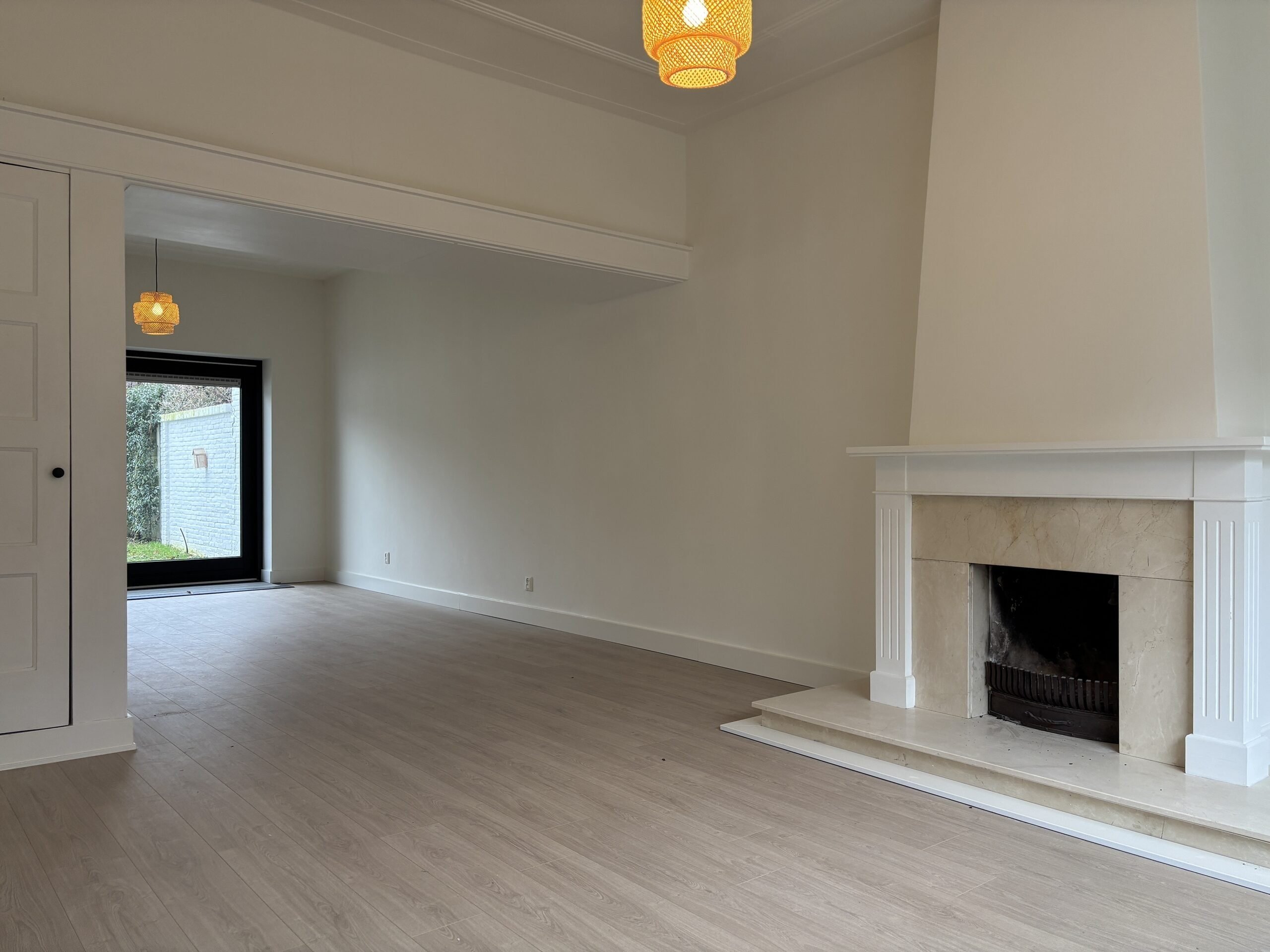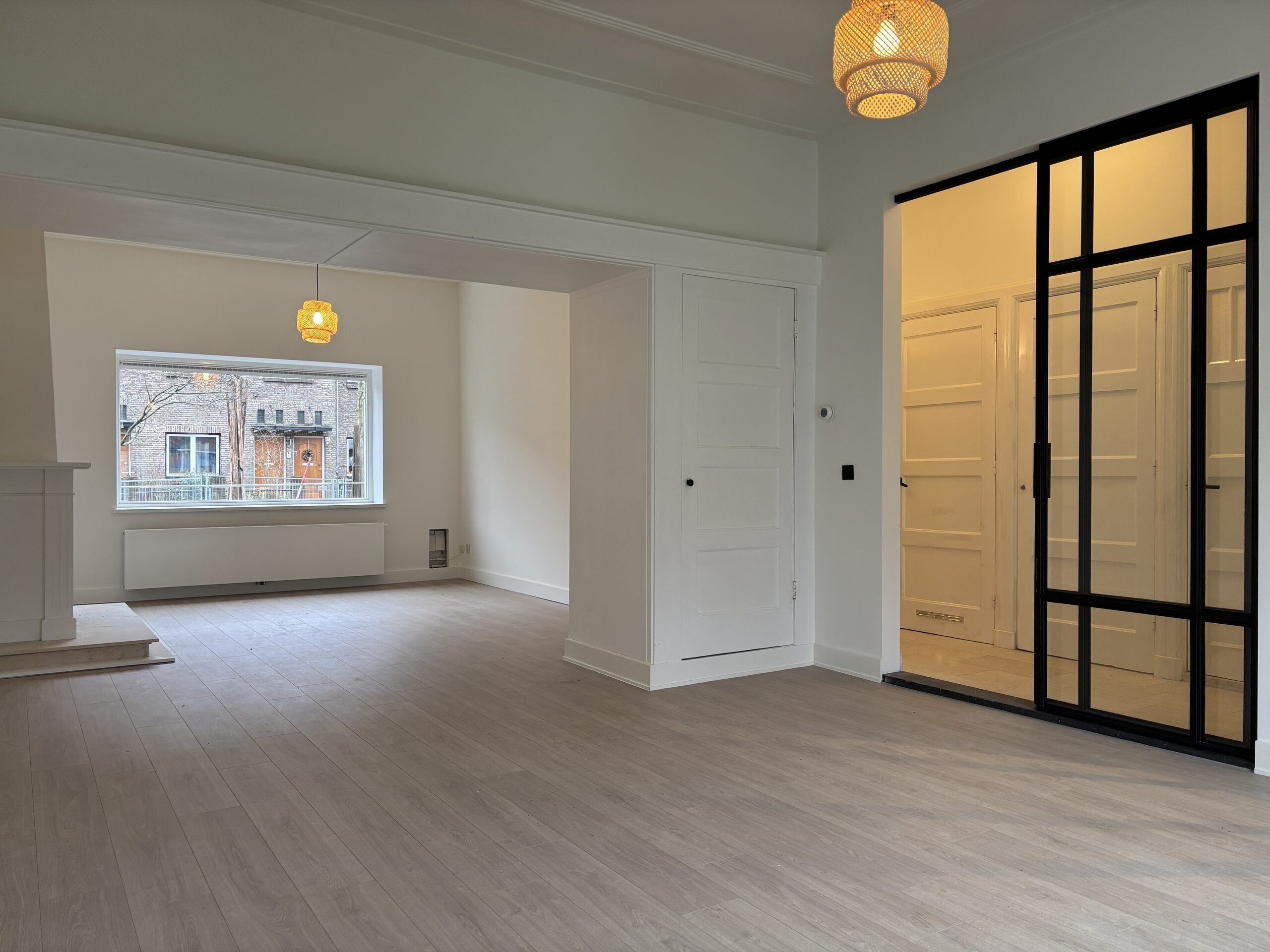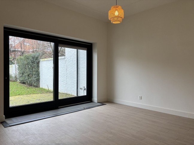 The spacious living room is exceptionally bright thanks to large windows at both the front and rear. At the back, wide sliding doors provide direct access to the garden, creating a seamless indoor-outdoor connection. Modern black steel pivot doors lead to the kitchen, adding a contemporary design touch while maintaining openness.