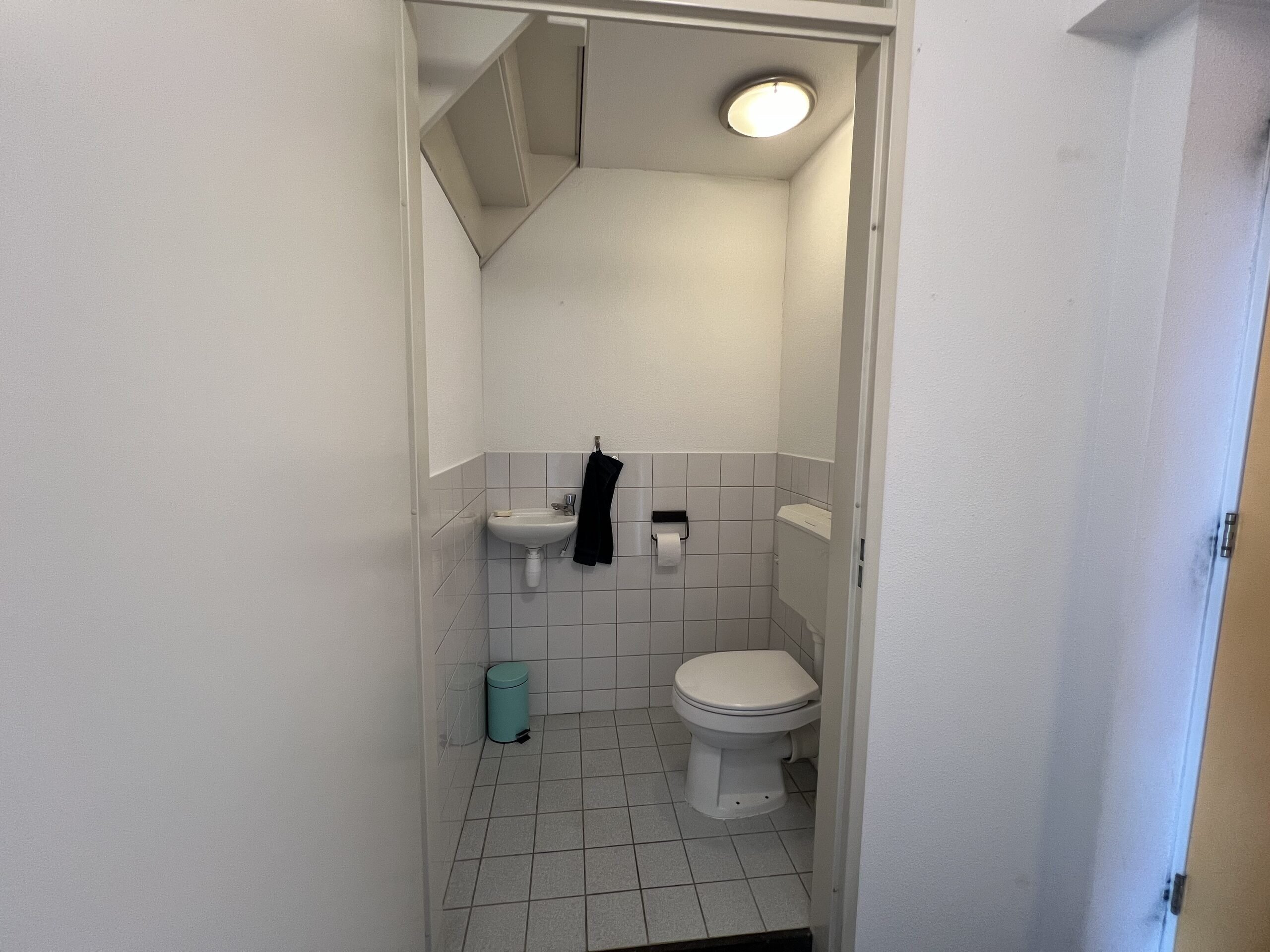 Hall with wooden floor, tiled toilet with sink. From the hall access to both the living room and the kitchen.