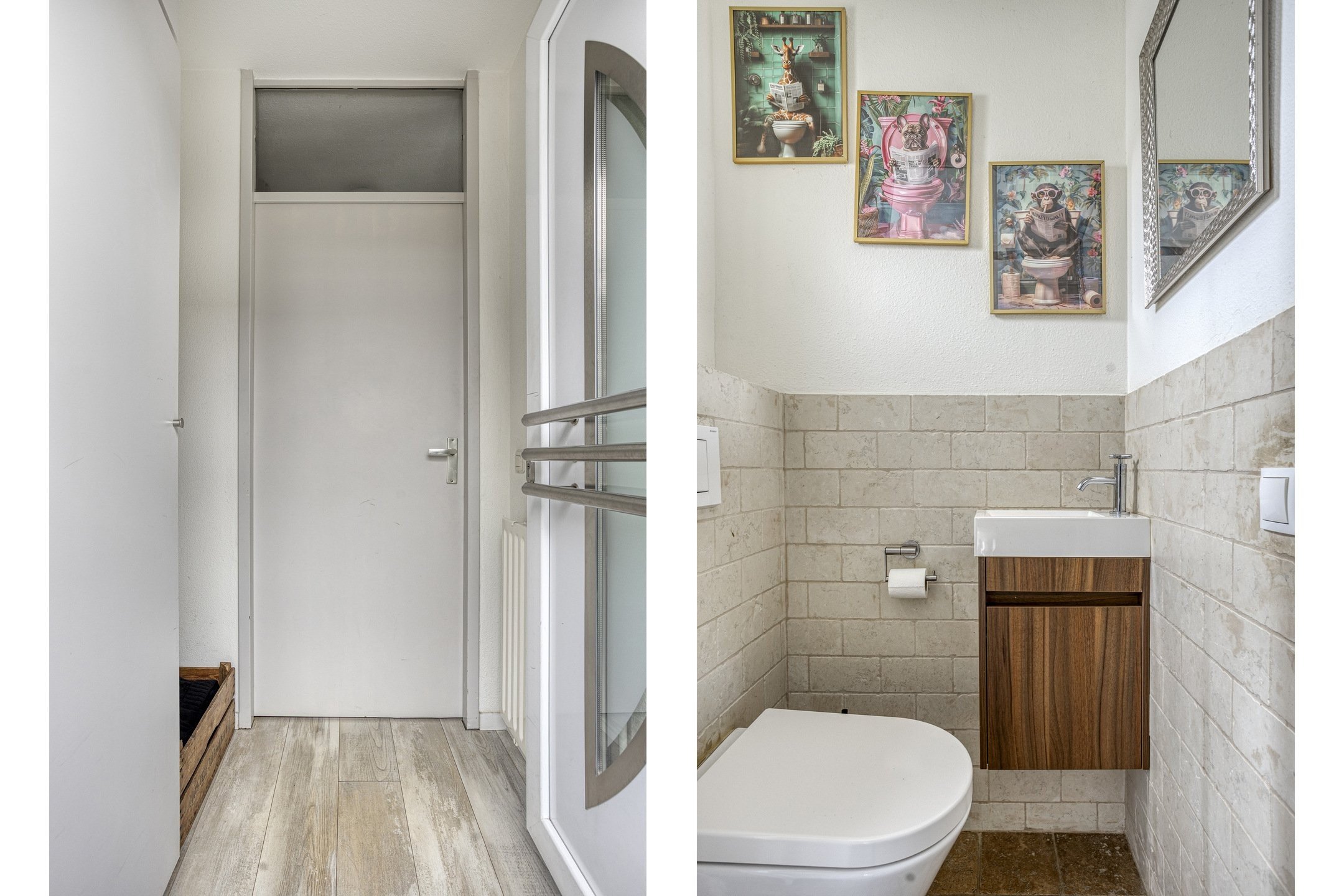 Through a second hall, you reach the toilet, the staircase to the first floor, and access to the garden.