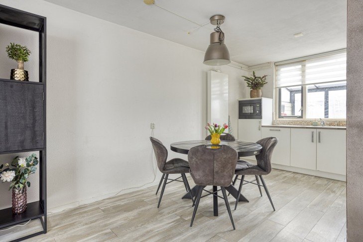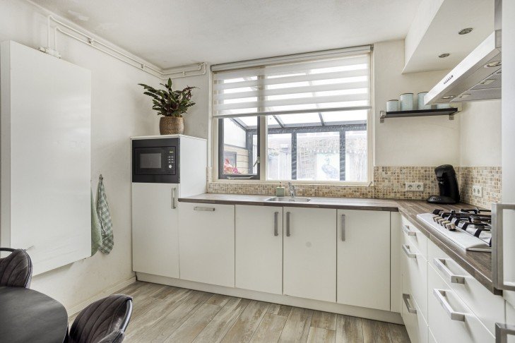 At the rear, you’ll find the open kitchen, also equipped with a window that brings in plenty of daylight while cooking. The kitchen is fully fitted with a combi-oven, dishwasher, 4-burner gas hob, extractor hood, fridge-freezer combination, and sink – everything you need within easy reach.