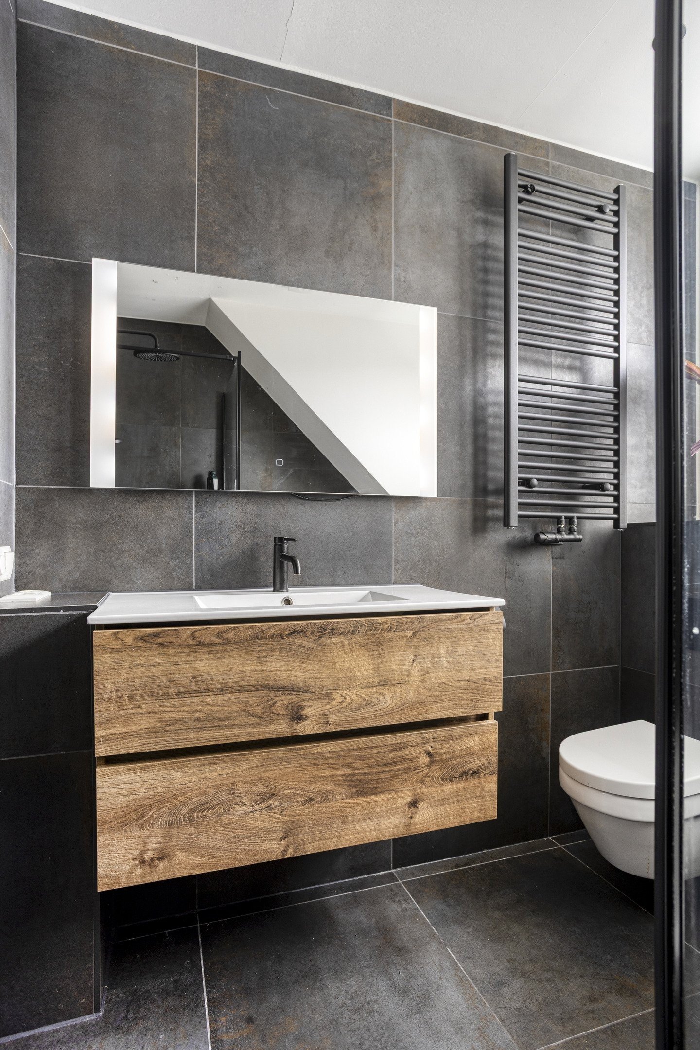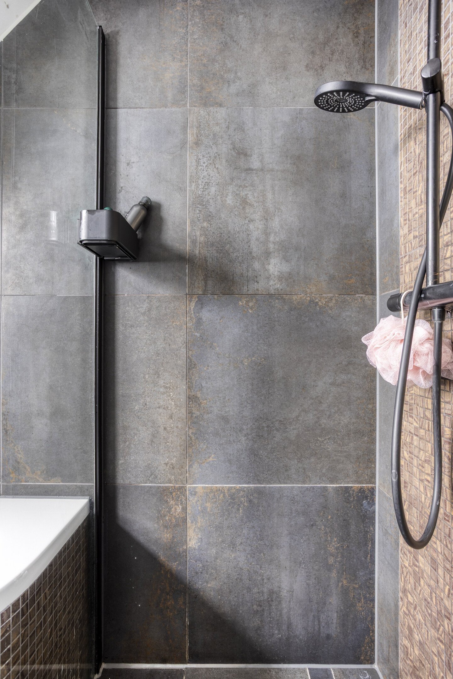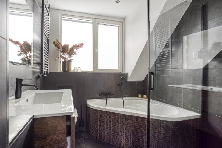 The bathroom (2021) is stylish and fully tiled, exuding luxury and comfort. It features a generous rain shower with glass screen, a bathtub with built-in thermostat, an elegant washbasin unit, a designer radiator, and atmospheric recessed lighting.