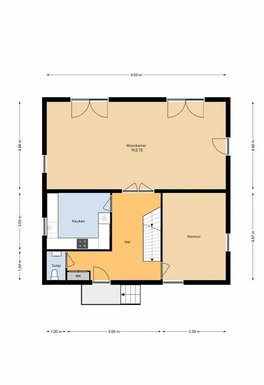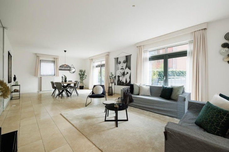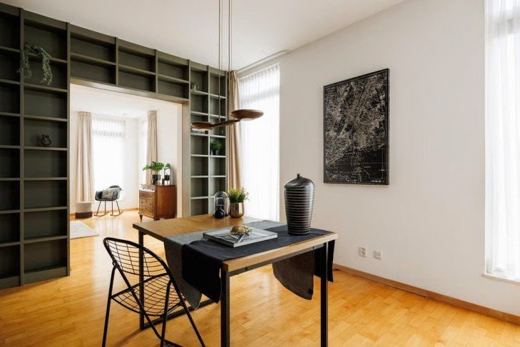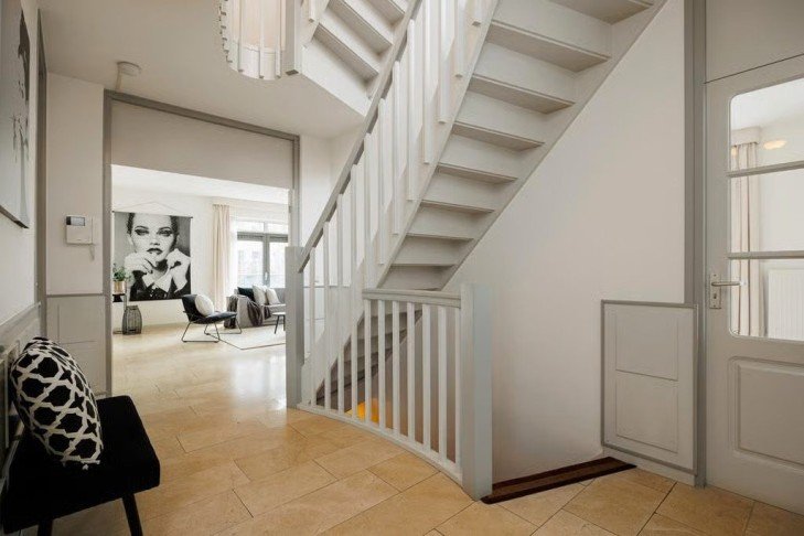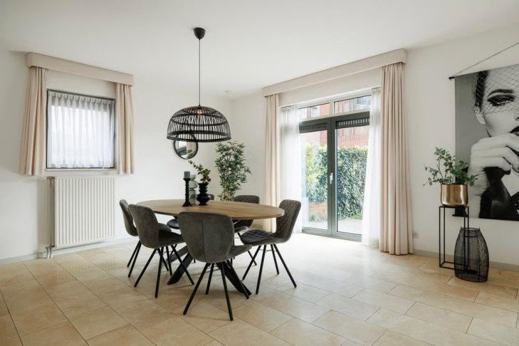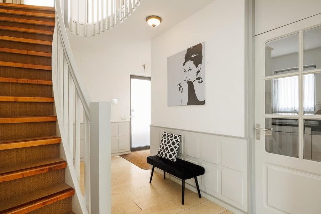 The moment you enter the impressive hallway, you feel the grandeur of this home. High ceilings, refined wall panelling and a striking staircase create an elegant first impression. The carefully chosen colours and materials give the space a warm and modern atmosphere. From the hallway, there is access to the toilet, the meter cupboard and double glass doors leading into the beautiful living room.