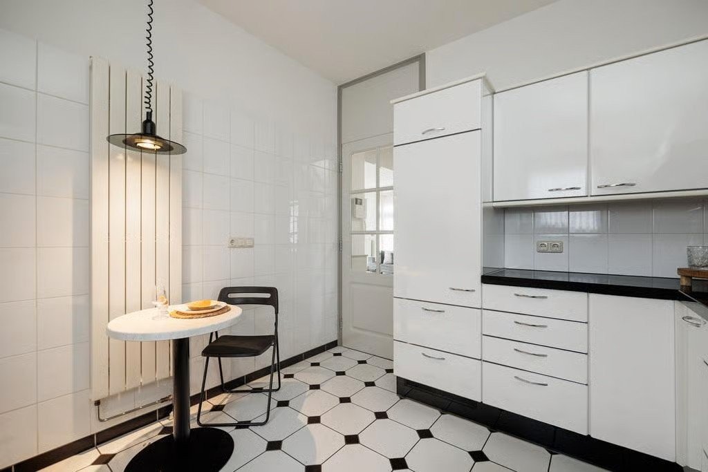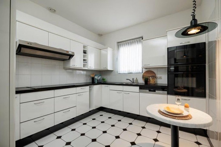 The separate kitchen is modern and fully equipped, laid out in a practical U-shape with an electric cooktop, oven, microwave, dishwasher and refrigerator. The black-and-white tiled floor complements the sleek cabinetry beautifully, while the sink under the window provides pleasant natural light and a charming view outside.