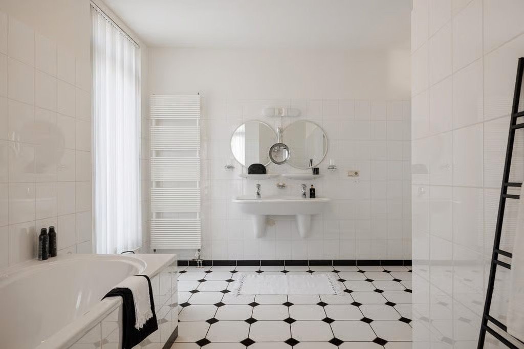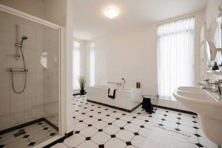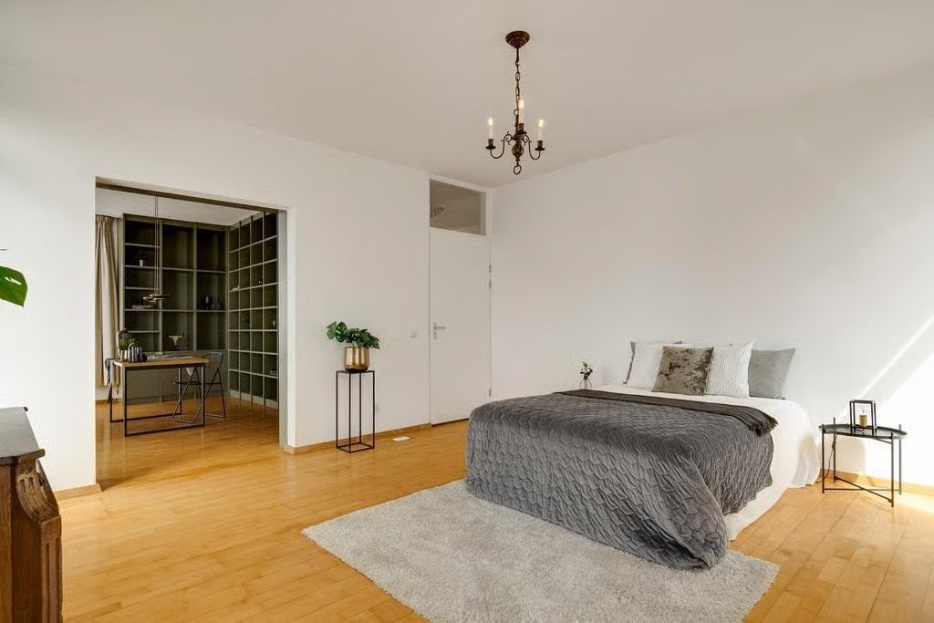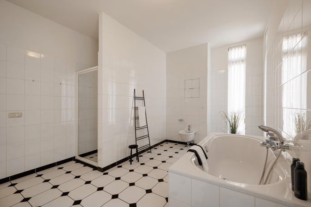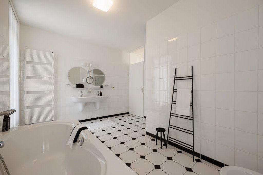 On the first floor, the current owners have created an elegant master suite consisting of a large bedroom and an adjoining multi-purpose room that can be used as a study, library or private lounge. Both rooms feature a beautiful parquet floor and are connected by an open passage with a custom-made wardrobe. A second spacious bedroom mirrors this layout on the opposite side of the house. The luxurious bathroom, finished in timeless black and white, includes a bathtub, walk-in shower, double washbasin, bidet and designer radiator. A separate toilet is also located on this floor.