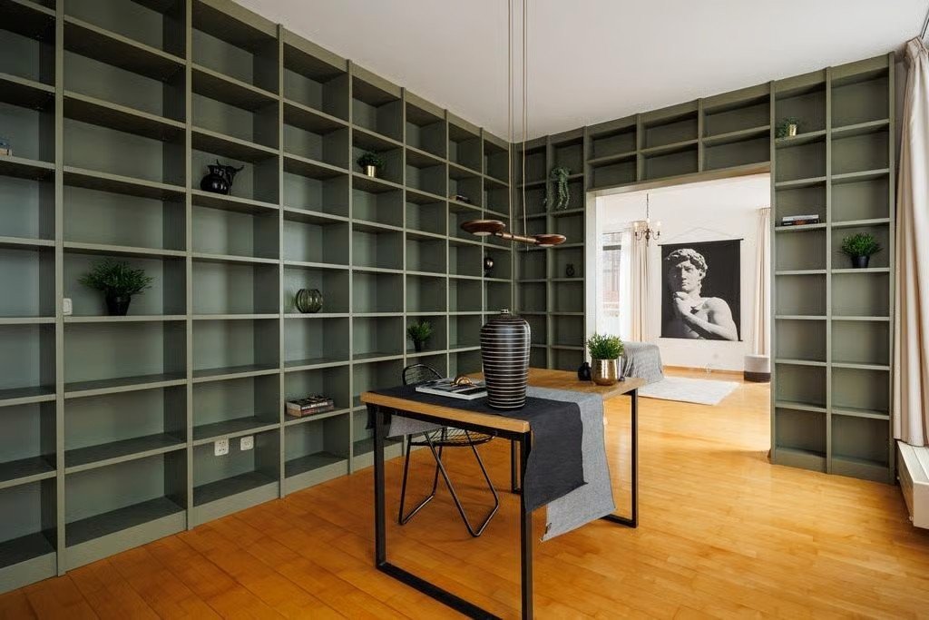 The spacious living area of approximately 45 m² feels bright and airy thanks to its high ceilings and generous windows. Two sets of French doors open directly onto the sunny, private city garden, creating a perfect indoor-outdoor flow. The travertine floor with underfloor heating extends throughout the ground floor, adding a sense of comfort and continuity. Adjacent to the living room is an additional room that can serve as a home office, study or TV room.