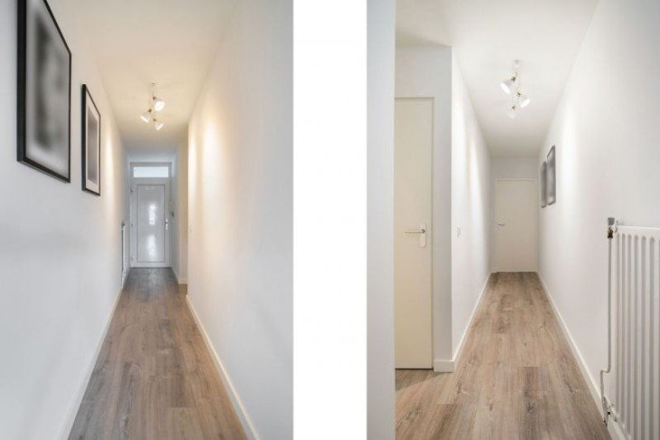 Behind the front door, the entire floor has a laminate floor with 10 cm high white skirting boards. The hall of the apartment offers space for the wardrobe and storage cupboard with the central heating boiler and connections for washing machine and dryer. The partly tiled toilet with hand basin is also accessible from this hall.