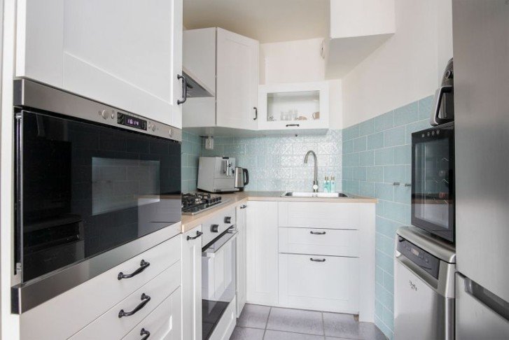 The semi-open kitchen has a tiled floor and is equipped with a 4-burner gas hob, oven, microwave, dishwasher, Bosch fridge-freezer combination and recirculation extractor hood. Various cupboards, drawers and a pan carousel are available for storing kitchen utensils.