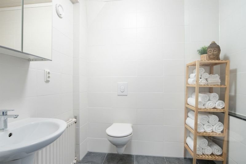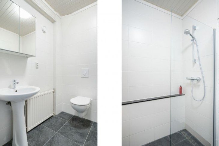 The modern bathroom can also be found on this floor with a spacious walk-in shower including thermostatic tap, washbasin, hanging closet and radiator. The space is fully tiled from floor to ceiling.