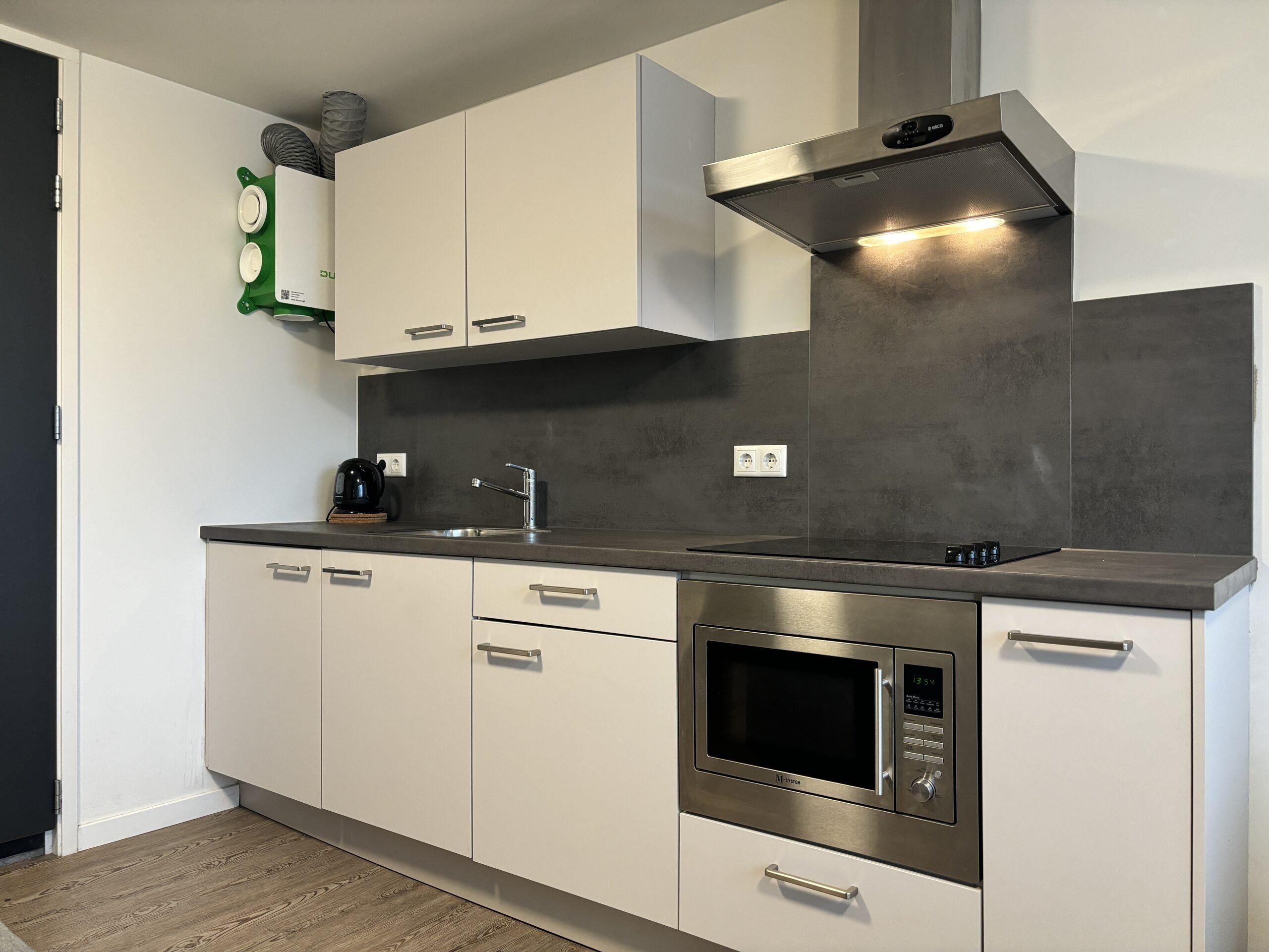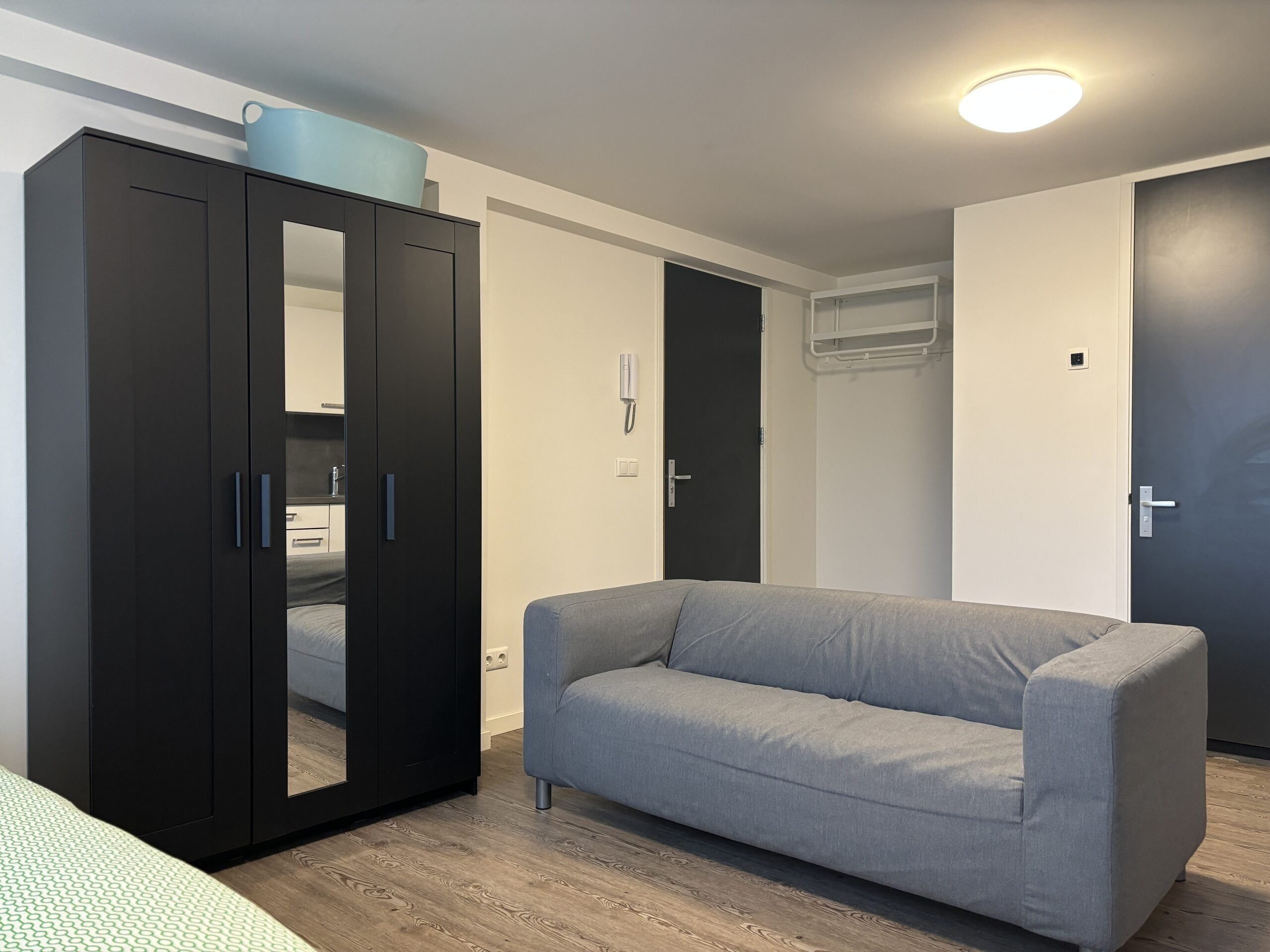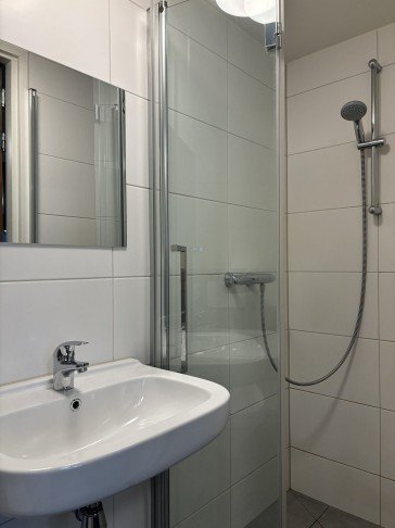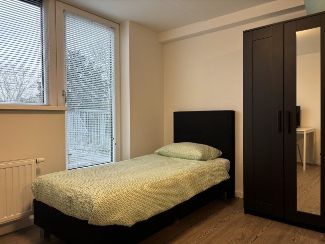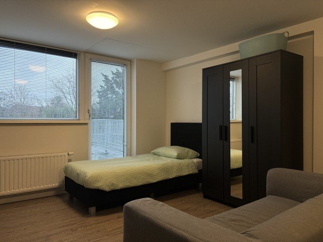 The studio is located on the ground floor and is approximately 25 sqm. The studio has a high ceiling and a large window. It is also equipped with a beautiful wood pattern PVC floor and 2 ceiling fixtures, curtains, plastic window frame with ventilation, Duco CO2 controlled ventilation and a flow device (fast hot water within 10 seconds).