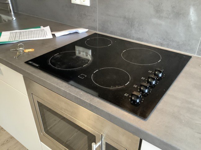 Open and modern kitchen, tiled and equipped with induction cooker and extraction hood, built-in fridge with freezer, microwave oven and various storage cabinets.