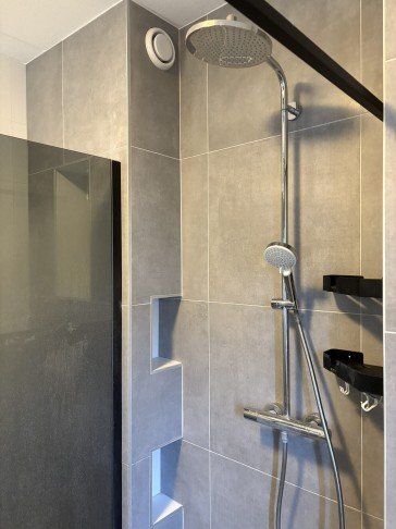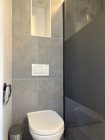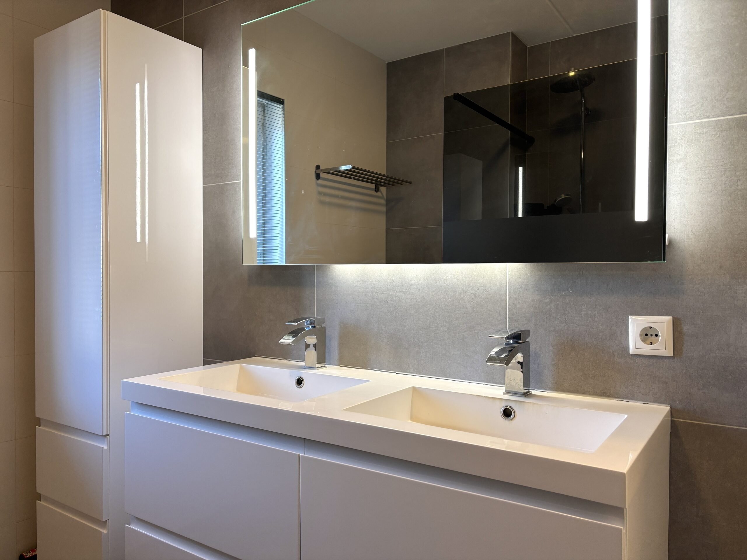 The bathroom is fully tiled and finished in a modern style, featuring a walk-in shower with rain shower head, a toilet, a double washbasin with vanity unit, and a mirror with integrated lighting and heating. In addition, there is a wall cabinet for extra storage.