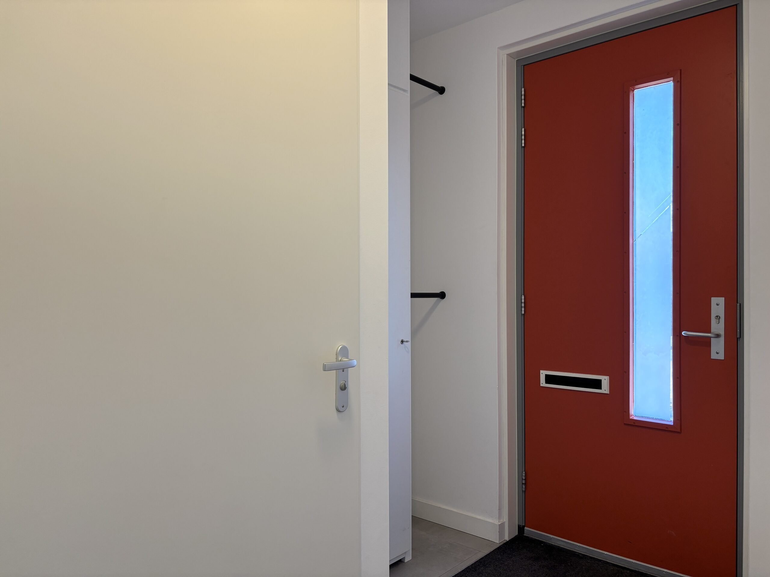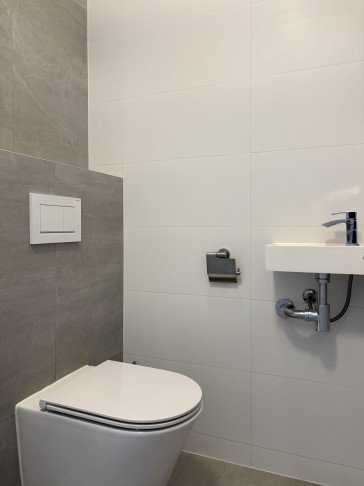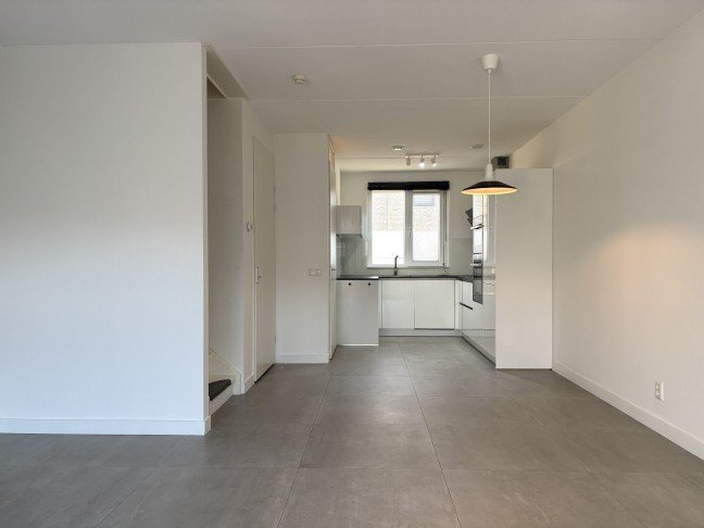 Through the entrance, you step into the hallway with cloakroom space and access to the fully tiled toilet with washbasin. From the hall, you can access both the kitchen and the living room.
